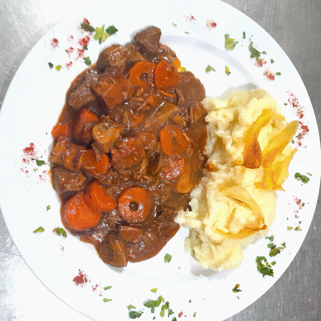 "Boeuf bourguignon". Guisado de lomo al vino tinto, panceta, champignones, cebolla y zanahorias, con acompañamiento de puré de papas