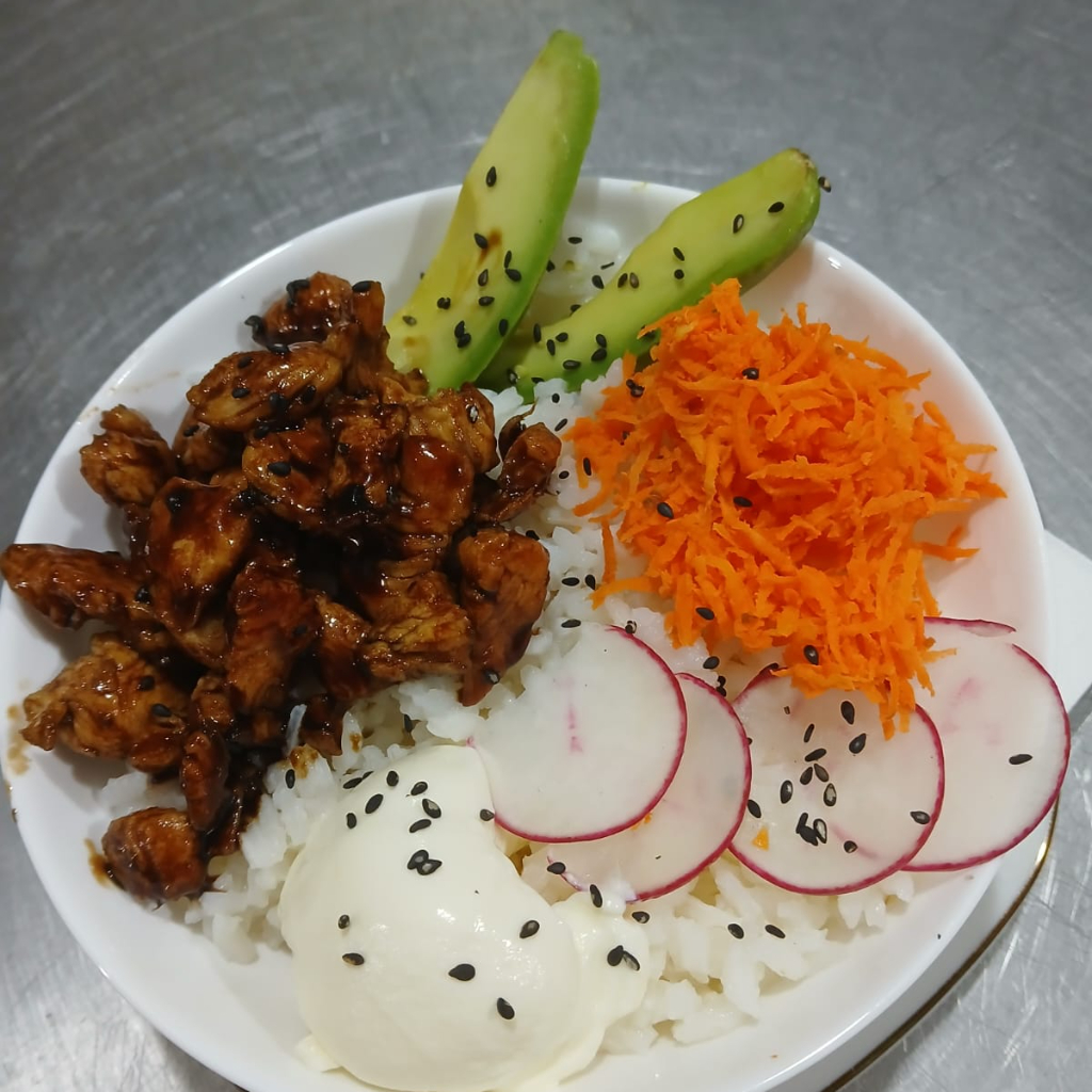 Ensalada Poke (arroz de sushi con mirín, copo de queso crema, zanahoria, rabanitos y palta más pollo al teriyaki)