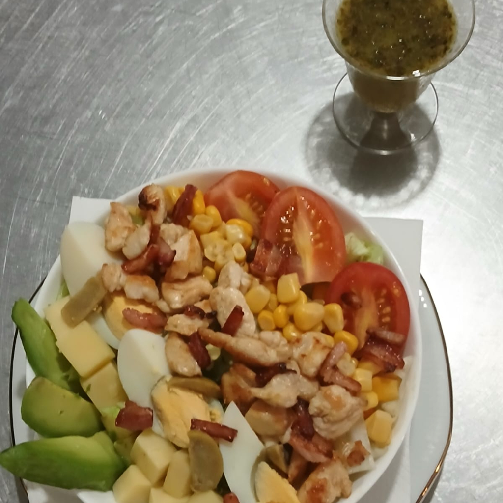 Ensalada Cobb (cubos de pollo, tomatitos, granos de choclo, huevo duro, cubos de queso, palta, aceitunas y panceta crispy sobre colchón de lechuga)