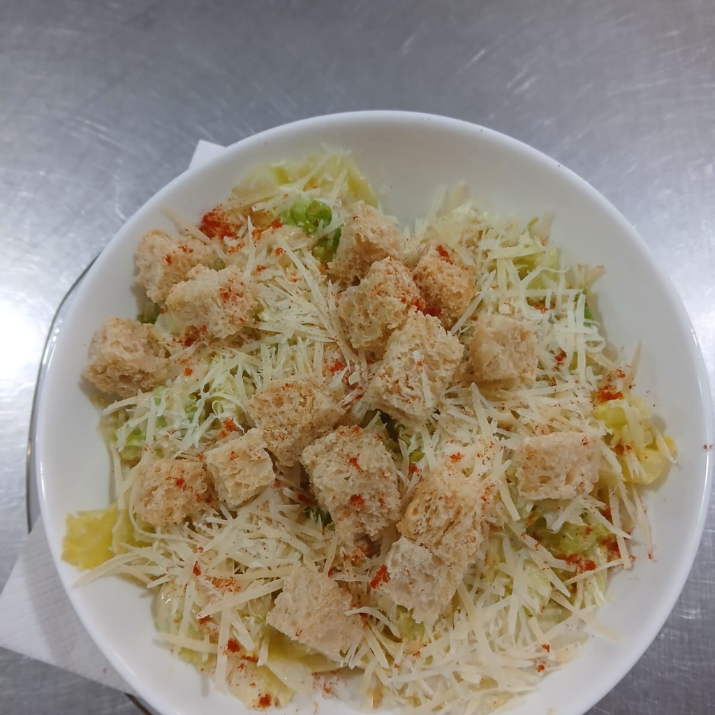 Ensalada César (Lechugas frescas con aderezo César, croutones y lluvia de queso)